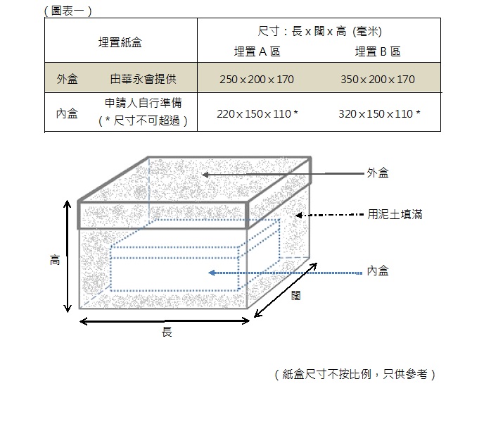 • 申請人須把離世胎兒放置在自行準備之可分解的紙盒或布等容器之內(下稱「內盒」),而該內盒將被放置於華永會提供之可分解的紙盒裡(下稱「外盒」),再埋置於所分配的位置。內盒尺寸須按華永會的規定,請參閱(圖表一)。